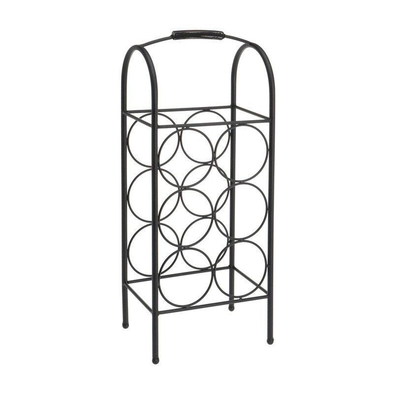 Tento elegantní stojan na 6 lahví je vkusným doplňkem nejen do moderních interiérů. Tento stojan je ideální pro skladování a vystavování nejrůznějších lihovin. Je ideální jako stojan na víno, i když by stejně dobře mohl sloužit jako organizátor pro jiné druhy nápojů nebo skleněné lahve s domácím džusem a sirupy. Stojan je vybaven rukojetí, která vám umožní snadné přemístění z místa na místo. Stojan je vyrobený z oceli opatřené černou práškovou barvou.