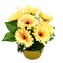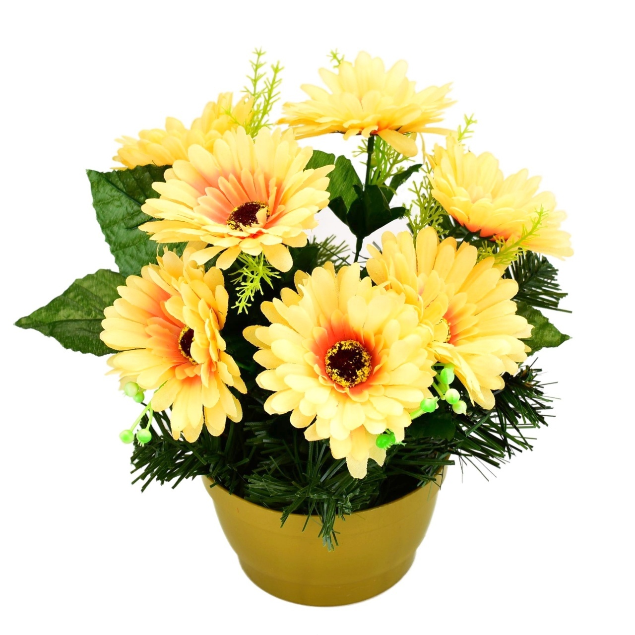 Miska se světle oranžovými gerberami 25×25 cm - Dekorativní miska se světle oranžovými gerberami je neodolatelnou dekorací pro Vaše prostory. - Stylový vývazek ze 7 květů gerber ve světle oranžové barvě dodá elegantní nádech každému interiéru. - Vyrobeno z kvalitních materiálů, jako je plast, kov, textil a cement, zaručuje trvanlivost a odolnost. - Ideální volbou pro smuteční dekoraci, která dodá prostoru úctu a důstojnost. - Kombinace s zlatým plastovým květináčem vytvoří luxusní a působivý design. - Rozměry 25 cm (výška) a 25 cm (šířka) zajistí stabilní umístění a pohodlné použití. - Nechte se okouzlit touto unikátní miskou a přidejte do Vašeho domova kousek elegance a krásy.