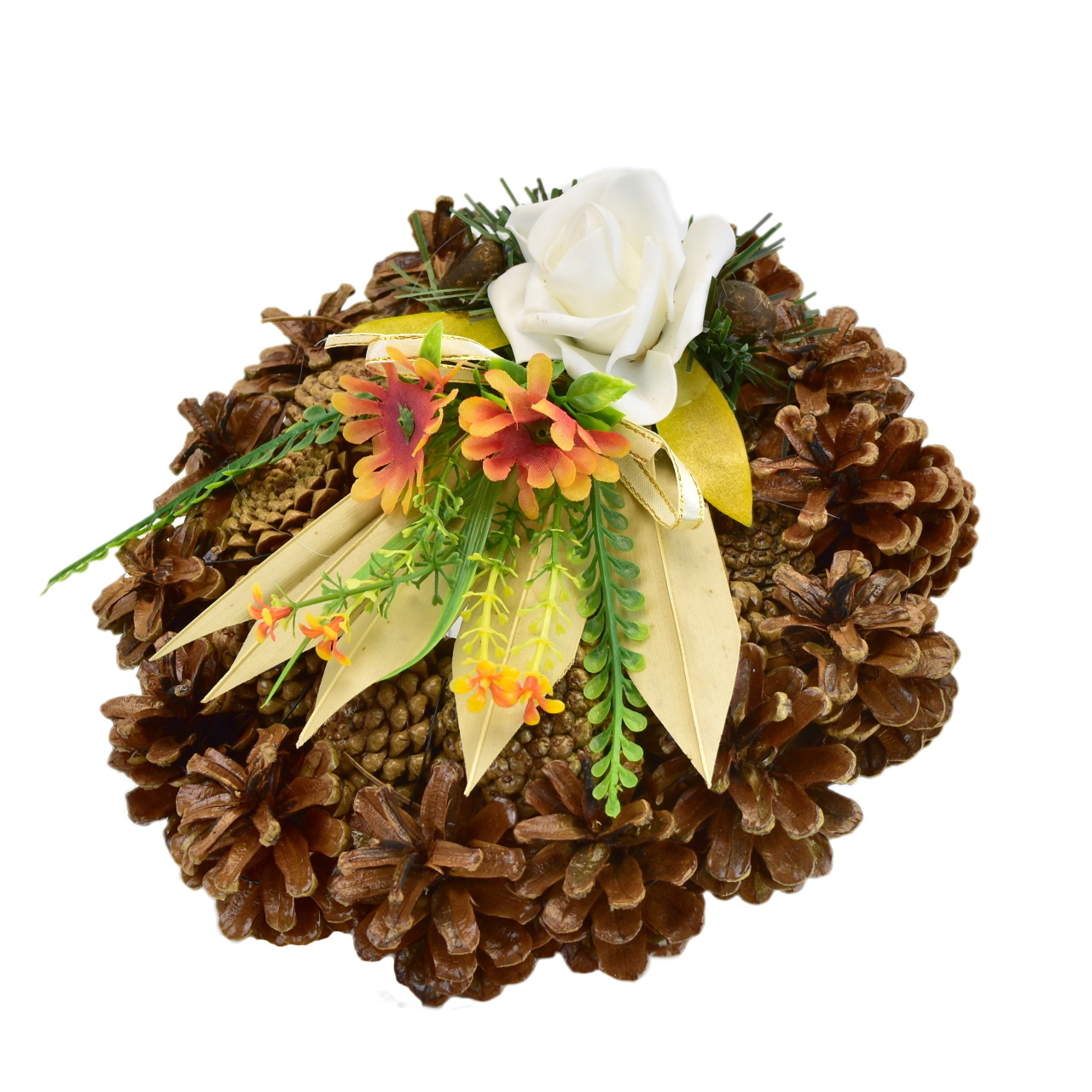 Šiškový věnec s bílou růží Ø22 cm je dokonalou dekorací pro vaše smuteční prostředí. Tento věnec je vyroben z přírodních lakovaných šišek a zdobí ho nádherná bílá růže, doplněná drobnými oranžovými kvítky, zelenými větvičkami a elegantní mašličkou.