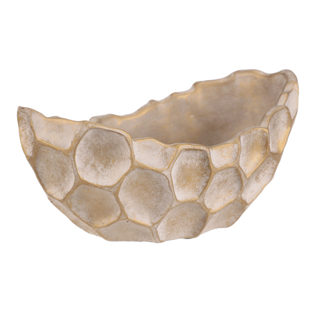 Béžovo-zlatý obal na květiny ve tvaru vaničky se vzorem připomínajícím plástev s nepravidelnými šestiúhelníkovými vzory, bude nádherným doplňkem zejména pro sváteční výzdobu. Je betonový, což zajišťuje jeho stabilitu, díky které bude pevným základem pro vaše oblíbené květiny, přízdoby a další...