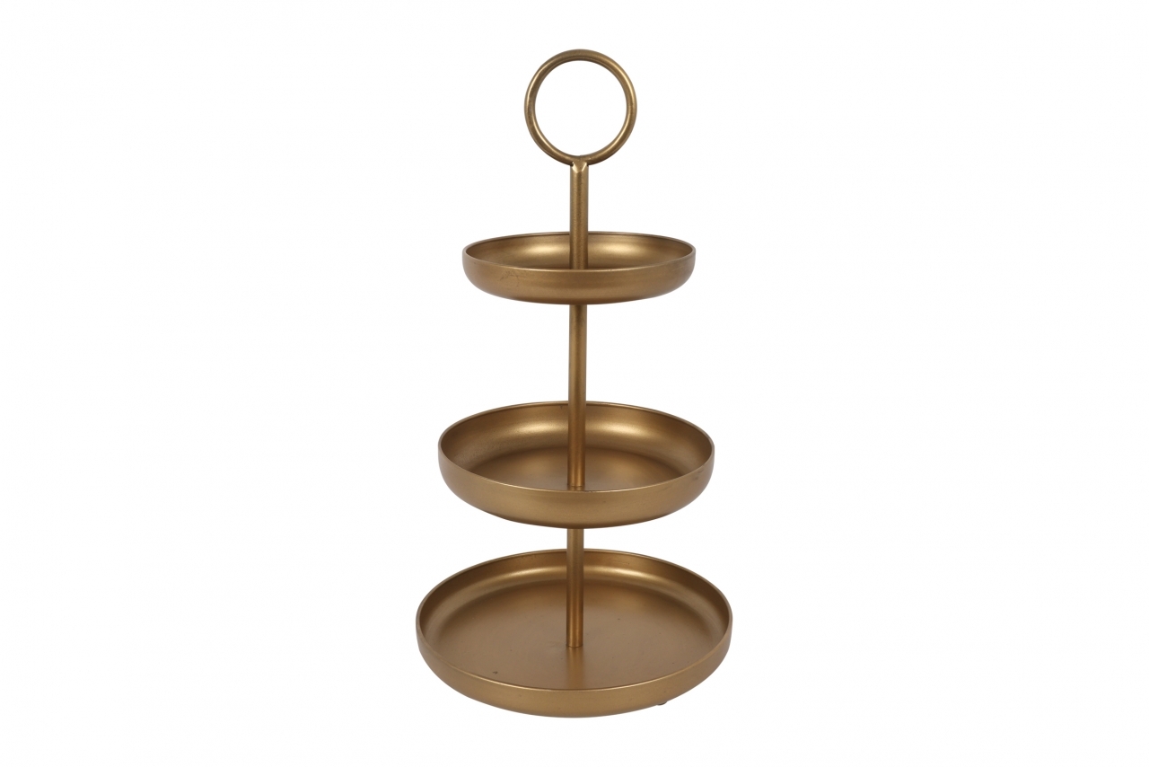 Elegantní třípatrový etažér Fenne M ve zlaté barvě představuje praktický a stylový doplněk pro servírování dezertů, ovoce či drobných pochoutek. Jeho minimalistický design a kovové provedení se snadno začlení do různých stylů interiéru.