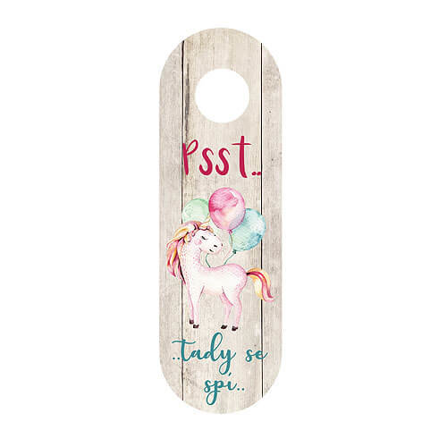 Dřevěný závěs na kliku pro děti a miminka - jednorožecCedulka na dveře pro děti, miminka a novorozence. Dárek pro při narození miminka, aby je nikdo nerušil při spánku. Originální nápis - Psst, tady se spí.Materiál: překližkaRozměr: 26 x 8 cm číst celé