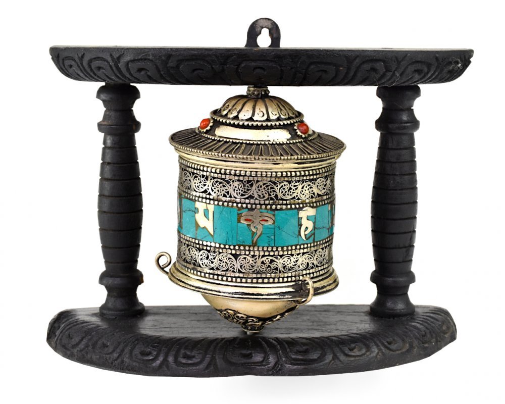 Točíme-li mlýnkem pravou rukou směrem od sebe, uvádíme, podle buddhistů, do chodu modlitby pomáhající nejen nám, ale i celému světu. Modlitební mlýnek je vlastně pouzdro na svitek s mantrami či jinými náboženskými texty, umístěné na žerdi, která umožňuje jeho točení.Rozměry: 13 x 18 x 9,5 cmMateriál: dřevo, kov, plastPrůměr mlýnku: 7 cm