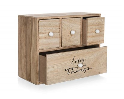Šperkovnice vzor III 25,5 x 20,5 x 12 cm, 4 šuplíky vybavené bílými úchopy. Z toho 3 menší šuplíky v jedné řadě a jeden větší s nápisem Enjou the little Things.