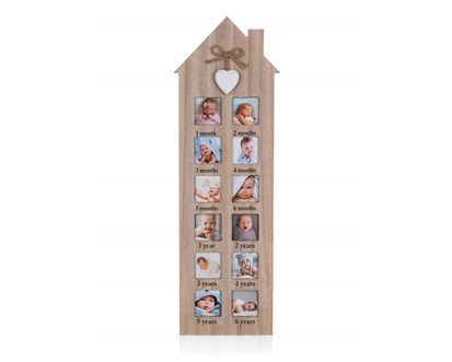 Tento originální fotorámeček má podobu vysokého domku s komínem, který díky svému designu nejenže zaujme, ale i krásně zapadne do dětského pokoje. Jeho konstrukce nabízí celkem 12 malých rámečků o rozměrech 5x5 cm, kde můžete vystavit fotografie vašeho dítěte s označením věku od 1. do 6. měsíce a od 1. do 6. roku. Díky tomu snadno sledujete jak malé, tak větší milníky ve vývoji vašeho dítěte.