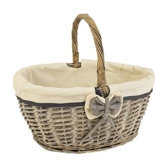 Košík bílý velký, látka šedá. Rozměry : 34 x 27 cm, výška 17 cm, celková výška s uchem 30 cm. Barva : šedá. Materiál : proutí, látka.