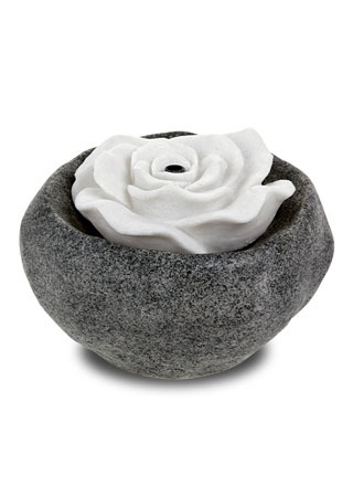 Zahradní fontána ve tvaru květu růže. Je vyrobena z polyresinu v dekoru černý kámen granit a polyresinový květ v dekoru bílého písku. Podsvětlení tryskající vody je LED diodami ve studeně modrém odstínu. Miničerpadlo je elektrické 240V / 12V s plynulou regulací.