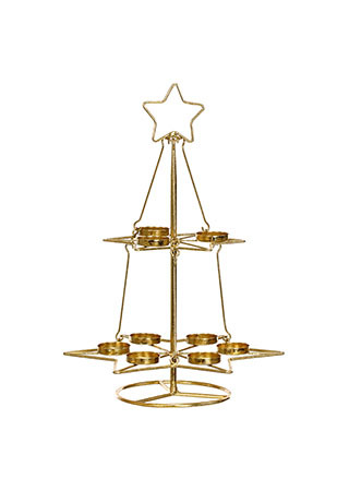 Kovový svícen ve tvaru stromku, barva zlatá.