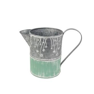 Konvička plechová moderního designu.Konvička má průměr 13 cm, celková šířka 24,5 cm, výška 17 cm, celková výška s uchem 18,5 cm.Konvička slouží k dekoraci, nedoporučujeme plnit vodou.Barva : kombinace šedá se zelenou.Materiál : plech. číst celé