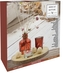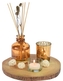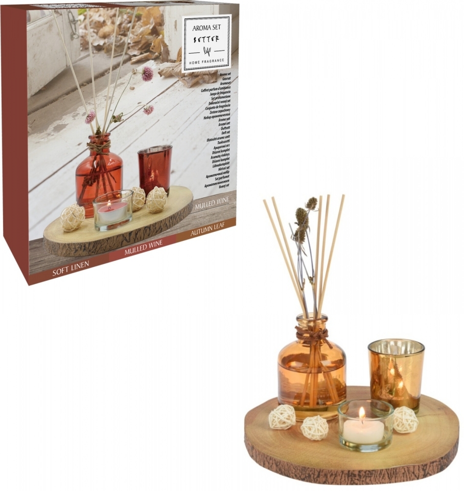 Dárková sada s osvěžovačem vzduchu. Sada obsahuje: 1x skleněný difuzér + 6x dřevěná tyčinka, 1x talíř imitace dřeva průměr 21,5 cm, 1x skleněný svícen čirý 2,5x5,3 cm, 1x květinová dekorace, 1x skleněný svícen barevný 6,5x5,5 cm, 3x dekorativní proutěné koule.