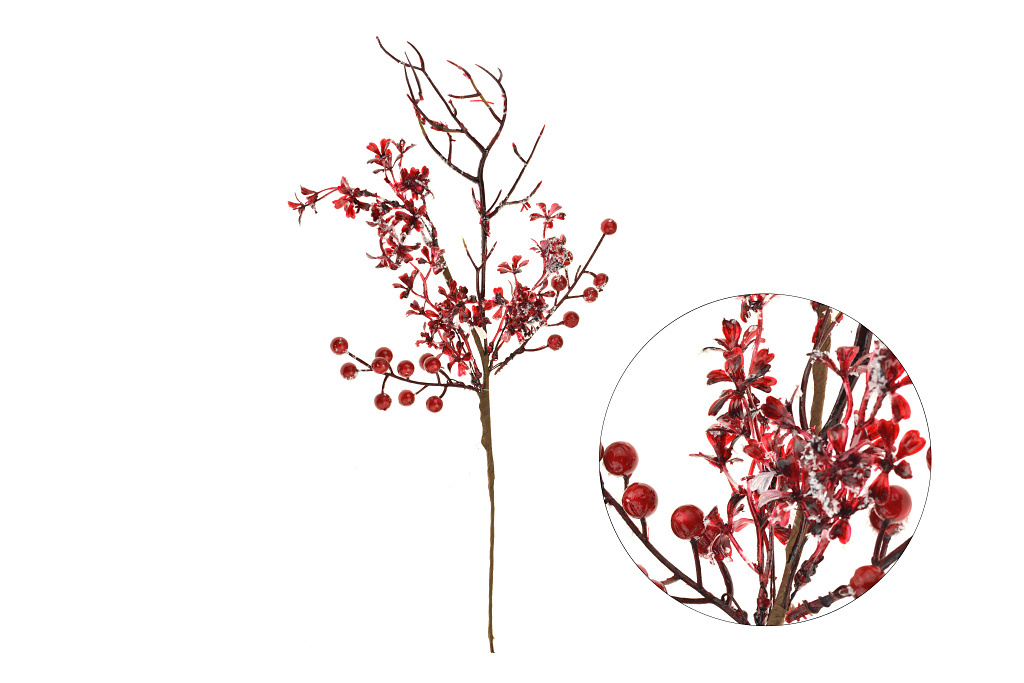 Zasněžená dekorace jeřabin a květů je spojena v jeden svazek omotaný floristickou páskou. Svazek je na kovovém drátku a je proto ohebný.