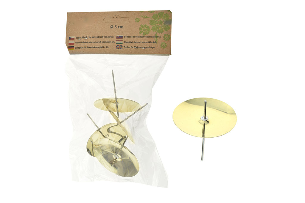 Bodce na svíčky pro adventní věnce Sada 4ks bodců pro adventní věnec nebo svícen. Bodce mají průměr 5cm, délka spodního hrotu je cca 4cm. Barva zlatá, materiál kov. V balení jsou 4ks bodců. číst celé