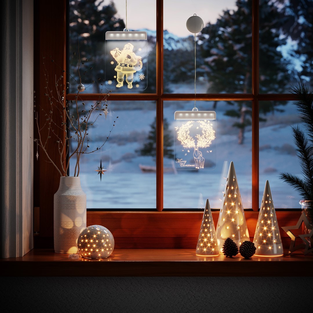 Světelné dekorace na zavěšení na okno v originálních provedení v rozměru 11,5x16 cm. Dekorace je vyrobena z akrylátu. Závěsný kabel je dlouhý 17 cm. Napájení je tužkovou baterií 3x AAA. Cena je za 1 kus v balení.
