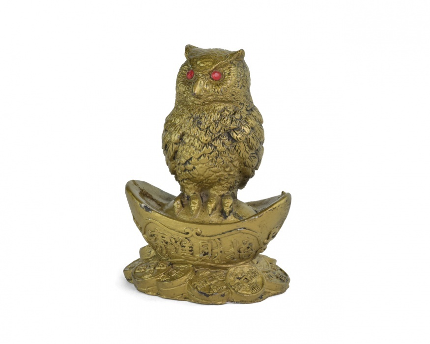 Sovička pozlacená 9 cm, sedící na ingotu