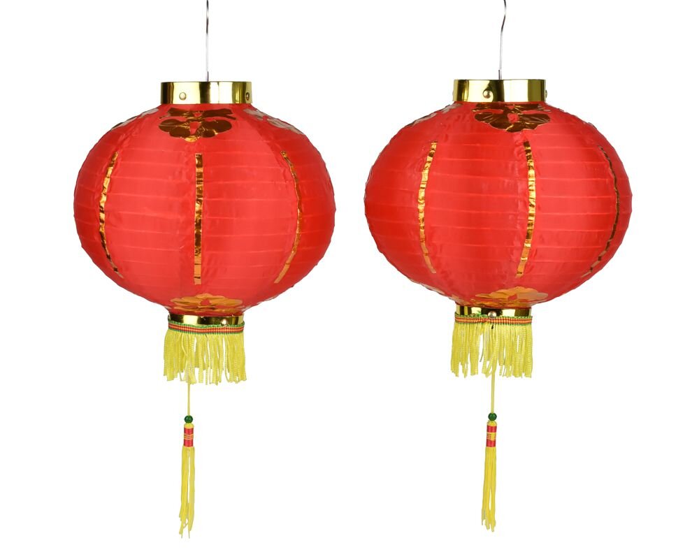 Dvojice tradičních čínských lampionů v červené barvě se zlatým dekorem a třásněmi.Parametry:Výška při zavěšení: cca 60 cmPrůměr: 35 cm Materiál: kov, látka