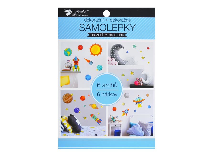 Dekorační samolepky na zeď vesmír, planety a rakety. Samolepky jsou vhodné na stěny, zrcadla, kachličky a jiné hladké plochy.