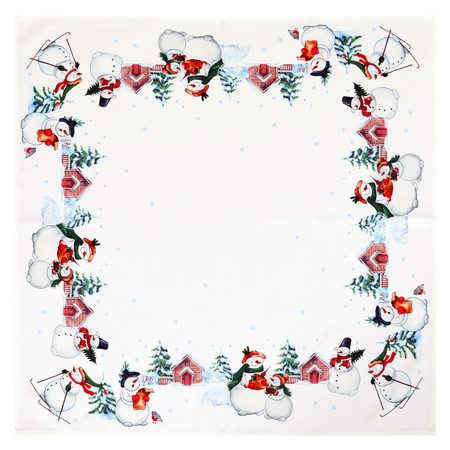 Ubrus bílý - se sněhuláky, 100% polyester, 80 x 80 cm.