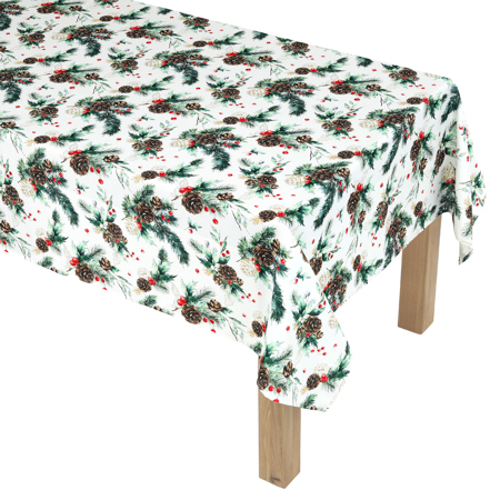 Vánoční ubrus s motivem jehličí, šišek a bobulí na čistě bílém podkladu přináší do interiéru svěží a elegantní sváteční atmosféru. Rozměr 130 × 160 cm je ideální pro větší stoly a rodinná setkání. Vyrobený ze 100 % polyesteru, snadno se udržuje a lze ho prát na 30 °C. Skvělá volba pro krásnou a praktickou výzdobu svátečního stolu.
