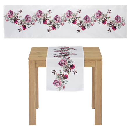 Běhoun s motivem růží bílé barvy. Rozměr 40x150 cm. Materiál 100 % polyester. Praní na 30°C.