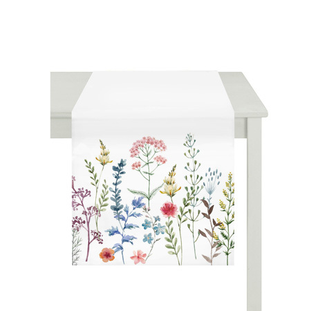 Běhoun s motivem lučních květů bílé barvy. Rozměr 40x150 cm. Materiál 100 % polyester. Praní na 30°C.