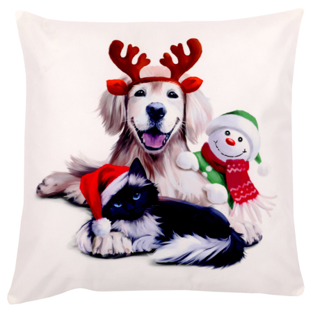 Polštář s výplní, samet. Vánoční motiv, pes, kočka a sněhulák. 45x45 cm.