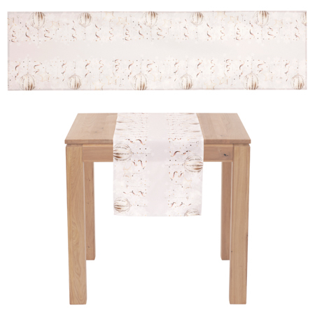 Jemný dekor v dokonalém spojení elegance a vánočních prvků dělá z tohoto běhounu jedinečný doplněk pro váš interiér nachystaný na nejkrásnější svátky v roce. S motivem ozdobných koulí rozprostřených na šedém pozadí se bude vyjímat jak na konferenčním, tak i jídelnovém stole nebo na komodě stojící poblíž ozdobeného stromku. Lze snadno kombinovat s dalšími textiliemi a dekoracemi.