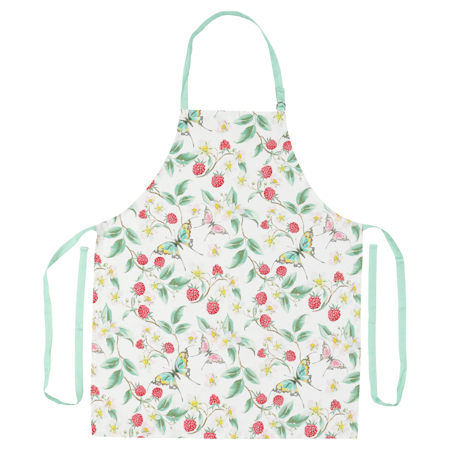 Tato látková zástěra s motivy zralých malin a nádhernými motýly je skvělým doplňkem pro všechny kuchaře do kuchyně i pro venkovní grilování a pikniky. Když si tuto zástěru na sebe nasadíte, budete nejen chráněni před skvrnami a špínou, ale také budete vypadat, jako byste měli kousek barevné louky či zahrádky sami na sobě. Budete tak stylově sladěni především do jarních nebo letních dnů. V této zástěře budete sklízet obdivy u všech kolem vás a budete oku lahodícím středem pozornosti.