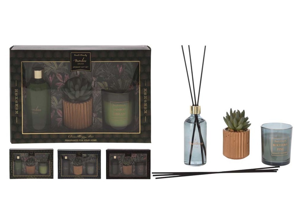 Sada dárková Sklo 1ks vonná svíčka 62x75mm + diffuser100ml + kaktus v cementovém květináči, mix