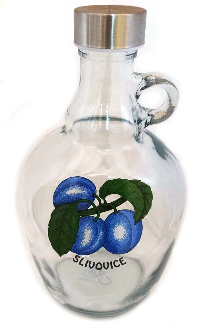 Demižon holý skleněný 1,5L ucho s uzávěrem ŠVESTKA - skladem, lehce poškozený kus