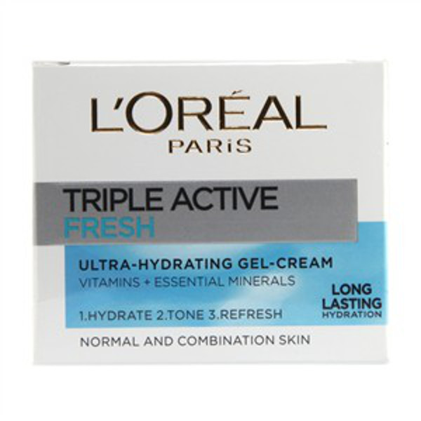 Hydratační pleťový krém **L´Oreal Paris Triple Active Fresh Hydrating Gel Cream**. Obohacen o vitamíny a esenciální minerály, které dokonale hydratují pokožku. Zanechává pleť zářící a zdravého vzhledu. Vhodné pro normální a smíšenou pleť. **Použití:** Aplikujte na čistou pleť. číst celé