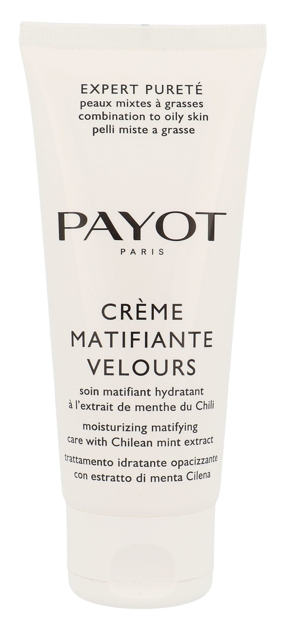 Matující pleťový krém **Payot Creme Matifiante Velours**. Pleťový krém Payot Creme Matifiante Velours pro matnou pleť bez lesku. Jemné složení hydratuje pokožku. Zabraňuje tvorbě nadměrného kožního mazu. Složení je obohacené o mátu a výtažek z růžového ovoce. Výsledkem je matná a zjemněná pleť. **Použití**: Aplikujte na čistou pleť.