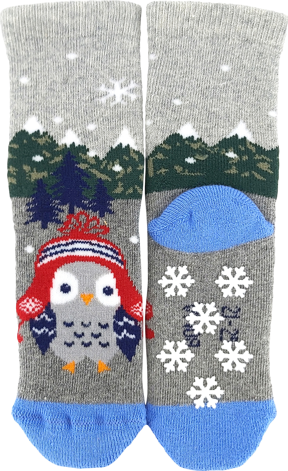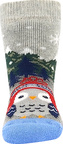 Kojenecké ponožky Boma® HUHIK ABS pro naše nejmenší zákazníky. Každá ponožka má obrázek roztomilé sovičky v zimní čepičce. Obrázkové ponožky mají jemný lem. Silnější ponožky jsou z bavlněného froté s podílem elastanu, takže jsou příjemné na pokožce ale zároveň jsou pružné a dobře si drží tvar. Aby ponožky netlačili, mají pro maximální pohodlí špičku spojenou jemným řetízkováním. Chodidlo mají opatřené protiskluzovými ABS body ve tvaru vloček.