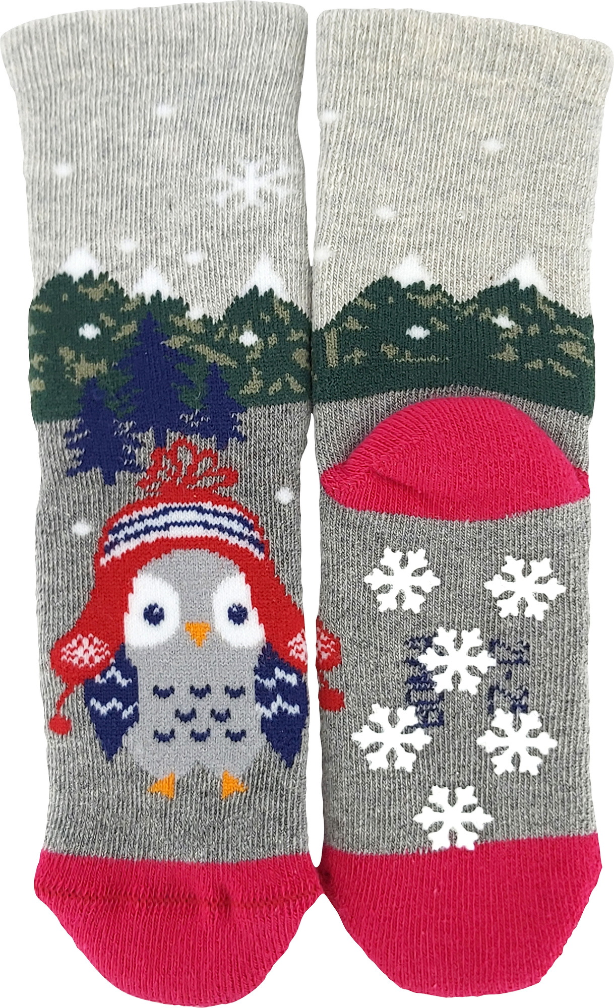 Kojenecké ponožky Boma® HUHIK ABS pro naše nejmenší zákazníky. Každá ponožka má obrázek roztomilé sovičky v zimní čepičce. Obrázkové ponožky mají jemný lem. Silnější ponožky jsou z bavlněného froté s podílem elastanu, takže jsou příjemné na pokožce ale zároveň jsou pružné a dobře si drží tvar. Aby ponožky netlačili, mají pro maximální pohodlí špičku spojenou jemným řetízkováním. Chodidlo mají opatřené protiskluzovými ABS body ve tvaru vloček.