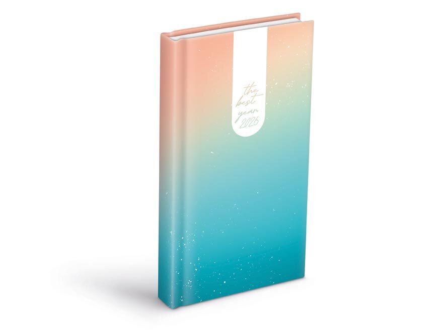 Denní diář pro rok 2026 vyniká svým jemným, ale výrazným designem - pastelový přechod z broskvové do tyrkysové působí jako klidný západ slunce na pobřeží. Bílé hvězdné tečky dodávají lehkost a hravost, zatímco nápis „the best year 2026“ na obálce Vám každý den připomene, že právě letos může být všechno tak, jak chcete.