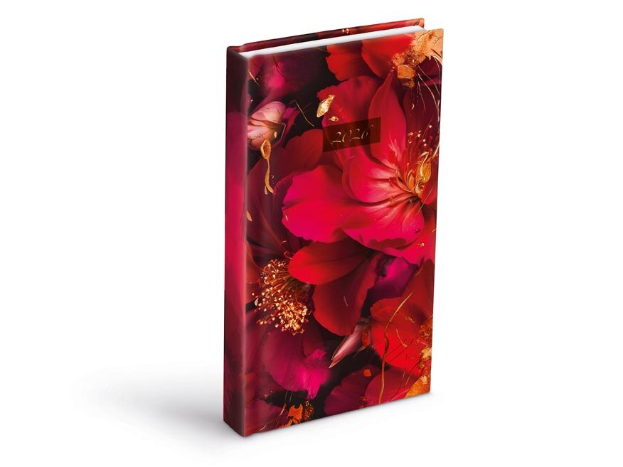 Výrazný vzhled pro výrazný rok!Denní diář 2026 zaujme na první pohled – jeho tmavě červené a vínové květy, doplněné o zlaté detaily, působí jako luxusní látka, která skrývá něco výjimečného. Je odvážný, ale stále vkusný. Elegantní, ale nepřehlédnutelný.Obálka je potažena matným laminem s...