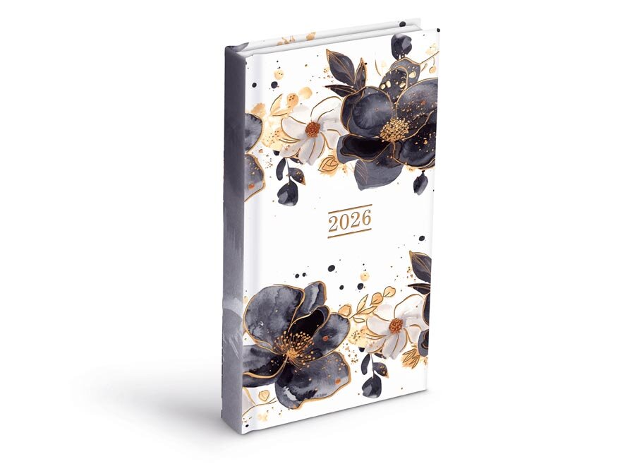 Denní diář 2026 v sobě nese noblesu i lehkost. Jeho bílý podklad zdobí výrazné květy v černých a zlatavých tónech, doplněné o jemné detaily, které působí jako rozptýlený inkoust na akvarelovém papíře. Výrazný, romantický, ale s moderním nádechem.