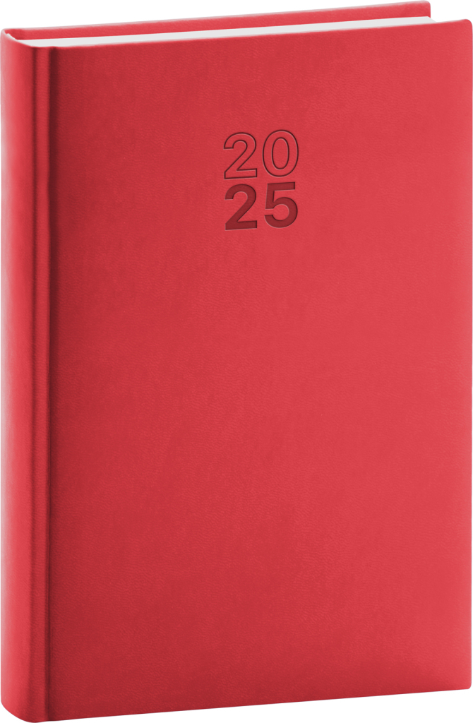 Denní diář Aprint 2025 v červené barvě. Nová kolekce vsadila na osvědčené barvy, které doplňuje nová ražba letopočtu. Denní rozvrh s česko-slovenským kalendáriem a doplňkovou angličtinou, němčinou, maďarštinou a ruštinou.
