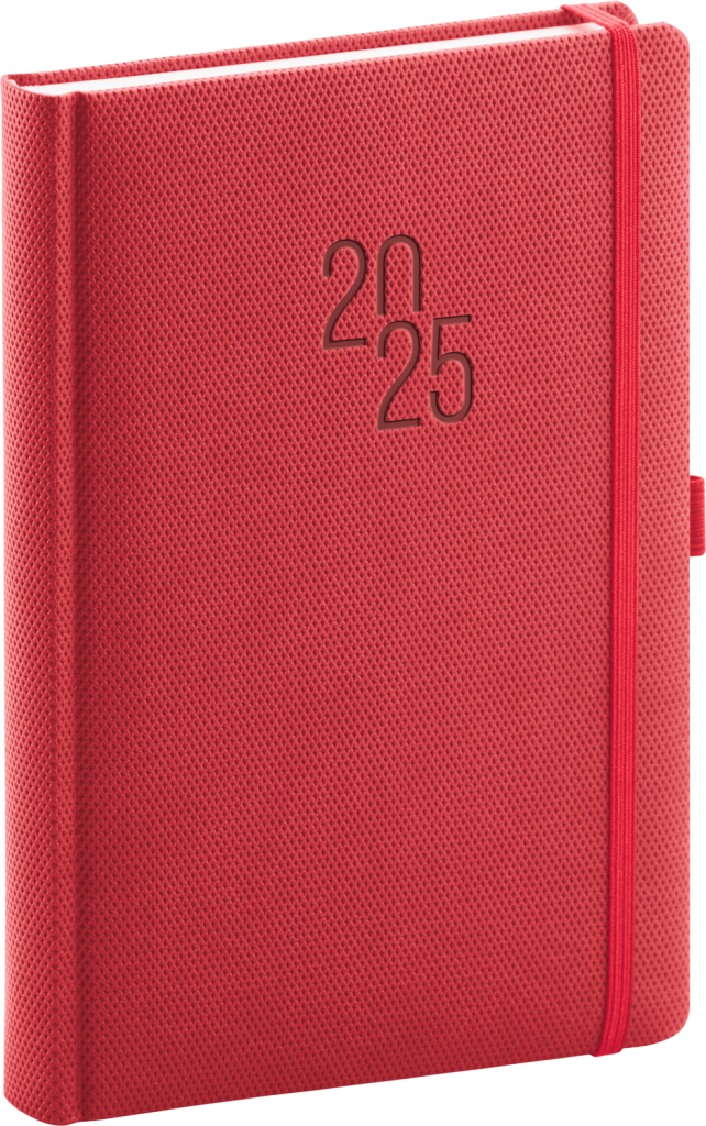 Denní diář Diamante 2025 v červené barvě. Nová kolekce vsadila na osvědčené barvy, které doplňuje nová ražba letopočtu. Denní rozvrh s česko-slovenským kalendáriem a doplňkovou angličtinou, němčinou, maďarštinou a ruštinou.