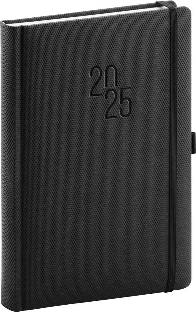 Denní diář Diamante 2025 v černé barvě. Nová kolekce vsadila na osvědčené barvy, které doplňuje nová ražba letopočtu. Denní rozvrh s česko-slovenským kalendáriem a doplňkovou angličtinou, němčinou, maďarštinou a ruštinou.
