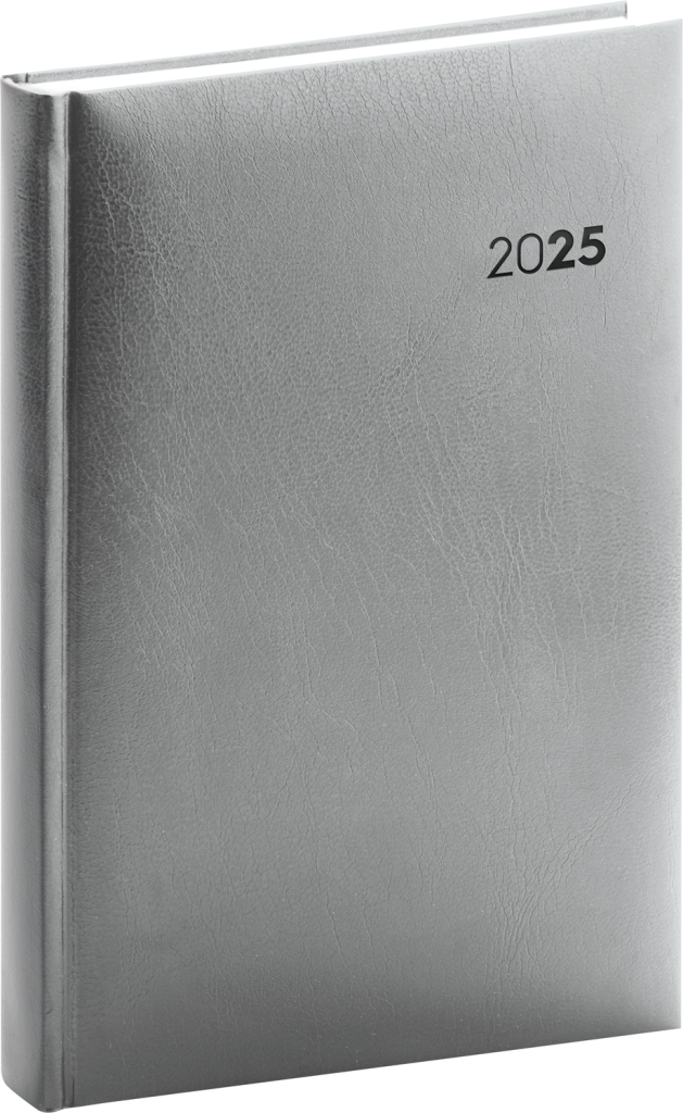Plánovací denní diář Balacron 2025 ve stříbrném provedení, doplněný o stříbrný letopočet. Povrch diáře si získal oblibu díky kvalitnímu svrchnímu materiálu, který je extrémně odolný vůči vnějšímu poškození. Denní rozvrh s česko-slovenským kalendáriem a doplňkovou angličtinou, němčinou, maďarštinou a ruštinou.