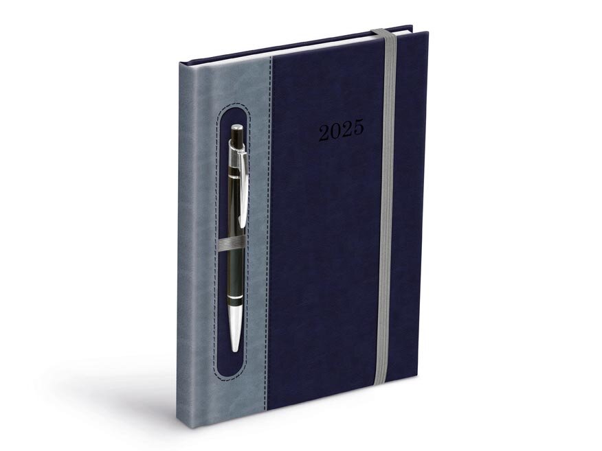 Denní diář pro rok 2025 ve formátu A5, v kombinaci tmavě modré a šedé barvy, s poutkem na propisku a uzavíráním na gumičku. Povrch obálky je vyroben z měkčeného materiálu příjemného na dotek. Je výborným pomocníkem pro organizování Vašeho času.