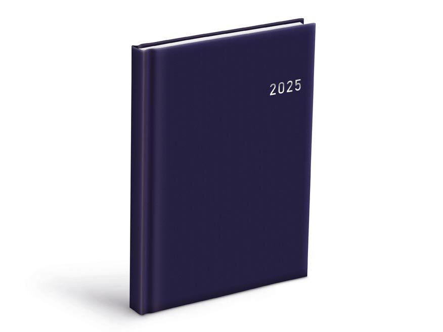 Denní diář pro rok 2025 ve formátu A5, v tmavě modré barvě. Povrch obálky je vyroben z PVC. Je výborným pomocníkem pro organizování Vašeho času.
