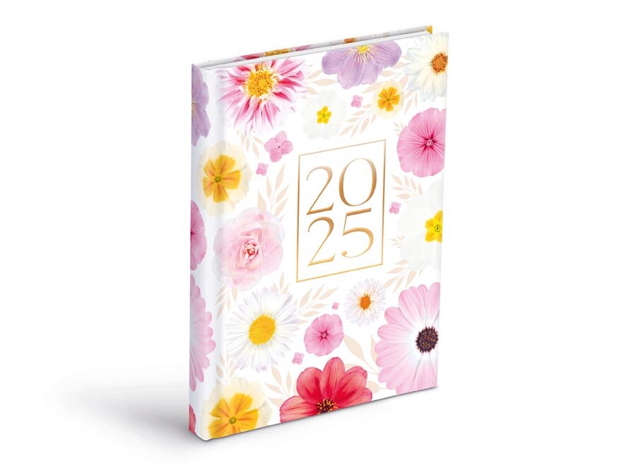 Organizujte si svůj rok 2025 stylově a efektivně s tímto elegantním denním diářem ve formátu A5. Díky květinovému vzoru a lesklému lamino povrchu bude nejen praktickým pomocníkem, ale i krásným doplňkem na vašem stole či v kabelce.