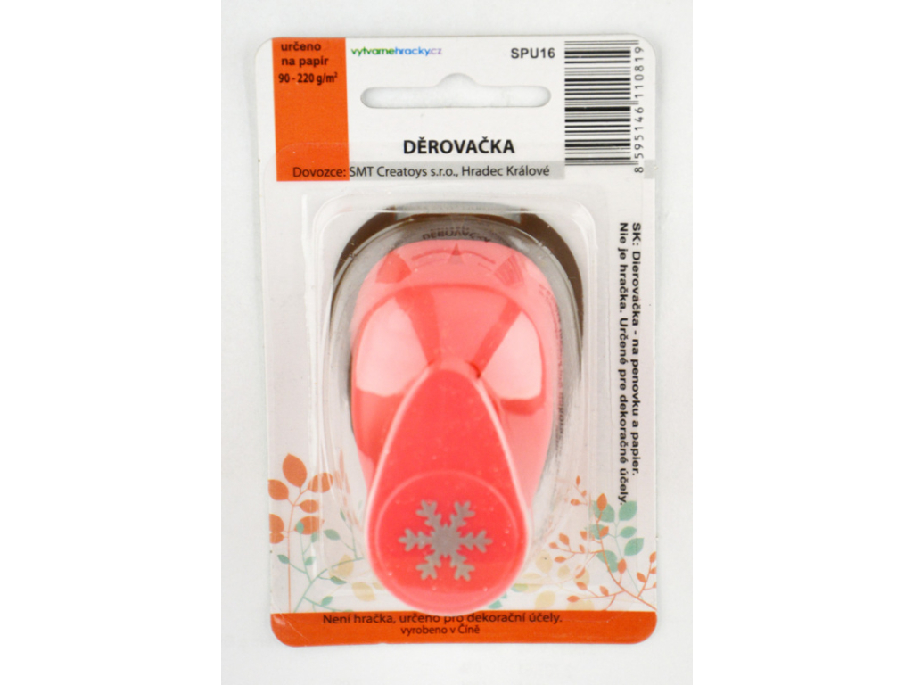 Děrovačka pro výtvarnou tvorbu. Postup: 1. pracujte s děrovačkou na pevné a rovné ploše. 2. vložte papír vhodné tloušťky - 90-220 g/m2 a zatlačte na páku statickým tlakem. Nikdy ne úderem na páku. 3. POUŽÍVEJTE POUZE NA PAPÍR. Děrovačky nikdy nepoužívejte na materiály potažené lepící vrstvou (například na samolepicí štítky), na pěnovku, na papírové ubrousky. Děrovačky nejsou vhodné pro děti do 3let.