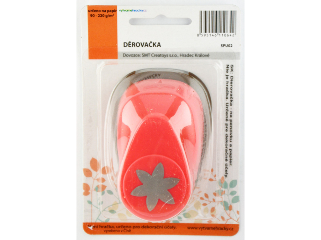 Děrovačka pro výtvarnou tvorbu. Postup: 1. pracujte s děrovačkou na pevné a rovné ploše. 2. vložte papír vhodné tloušťky - 90-220 g/m2 a zatlačte na páku statickým tlakem. Nikdy ne úderem na páku. 3. POUŽÍVEJTE POUZE NA PAPÍR. Děrovačky nikdy nepoužívejte na materiály potažené lepící vrstvou (například na samolepicí štítky), na pěnovku, na papírové ubrousky. Děrovačky nejsou vhodné pro děti do 3let.