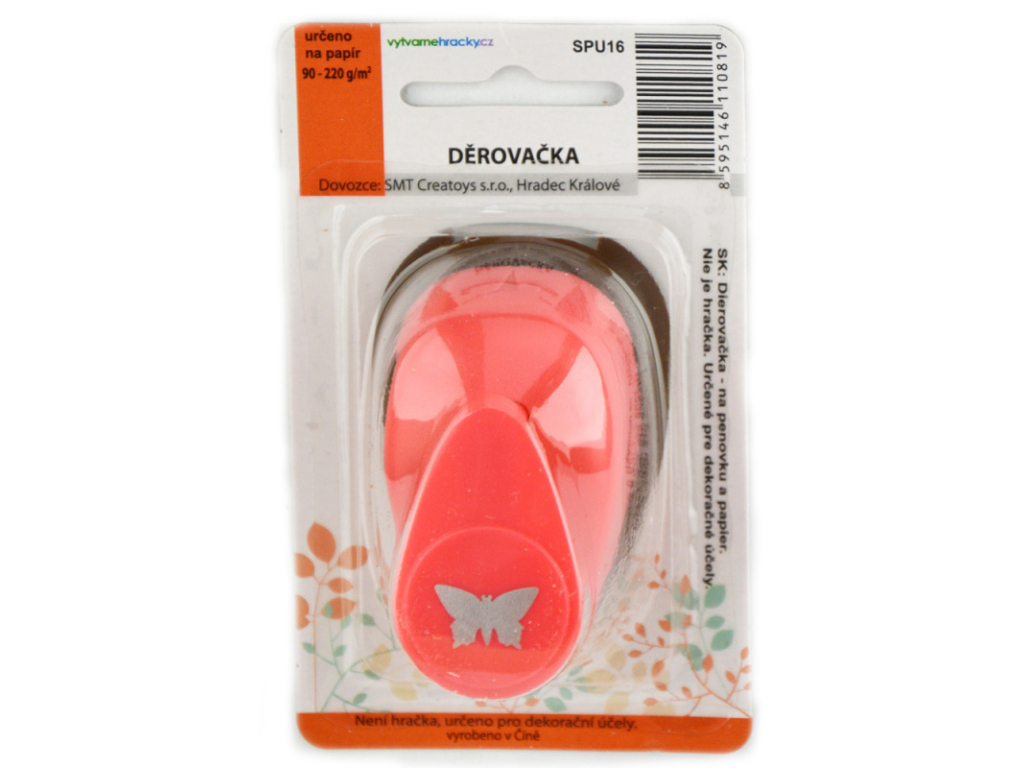 Děrovačka pro výtvarnou tvorbu. Postup: 1. pracujte s děrovačkou na pevné a rovné ploše. 2. vložte papír vhodné tloušťky - 90-220 g/m2 a zatlačte na páku statickým tlakem. Nikdy ne úderem na páku. 3. POUŽÍVEJTE POUZE NA PAPÍR. Děrovačky nikdy nepoužívejte na materiály potažené lepící vrstvou (například na samolepicí štítky), na pěnovku, na papírové ubrousky. Děrovačky nejsou vhodné pro děti do 3let.