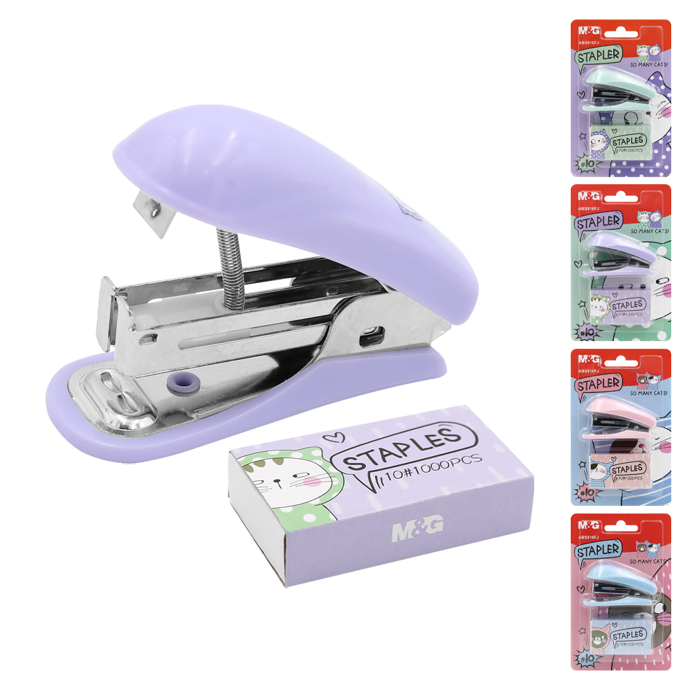 Mini sešívačka vhodná pro studenty právě svými malými rozměry v pastelové modré, růžové, fialové nebo zelené barvě.