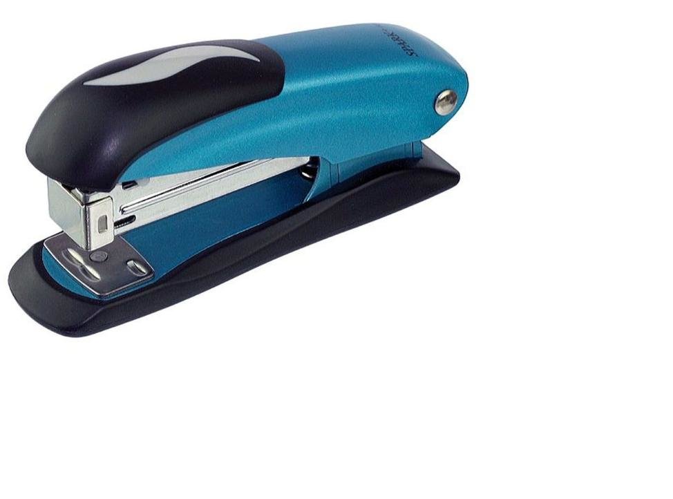 Mały metalowy zszywacz 2461 z przeciwpoślizgową nakładką z miękkiego tworzywa, zszywki 24/6 lub 26/6, zszywa do 20 kartek papieru jednocześnie, zasięg zszywania do 50 mm, kolory: niebieski BLUE METALIC, seria Spark-Line. číst celé