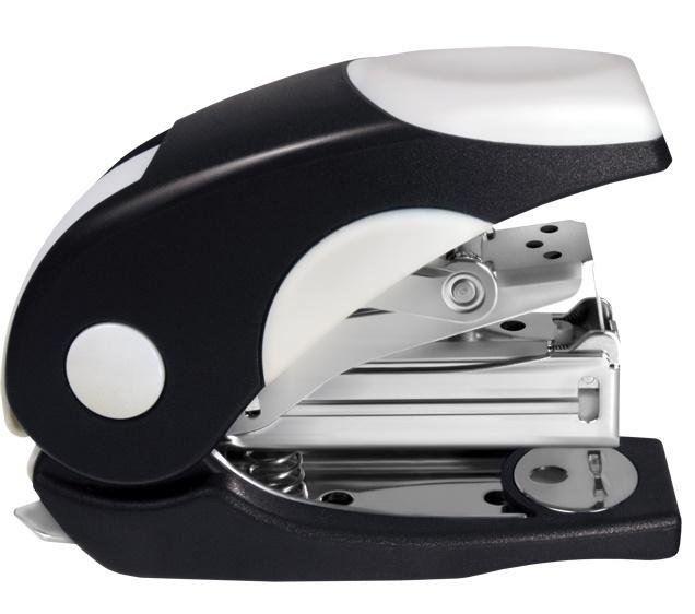 Mini zszywacz w obudowie z tworzywa sztucznego, części mechaniczne metalowe. Zszywanie zamknięte. Specjalnie skonstruowana dźwignia redukuje siłę nacisku do 50%. Dostosowany do zszywek o rozmiarach: 24/6-26/6. Zszywa do 20 kartek. Dodatkowo wyposażony w metalowy rozszywacz. Głębokość wsuwania kartek: 40 mm. Pojemność magazynka: 50 zszywek. Opakowanie: blister.
