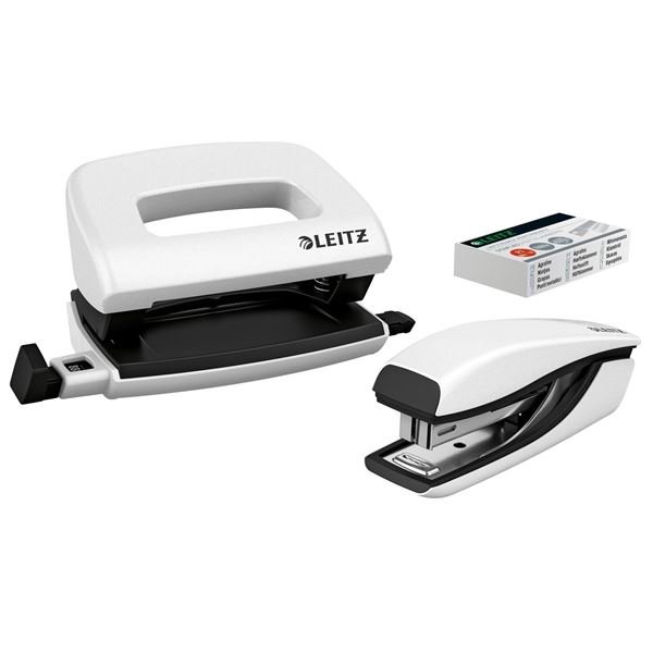 Sada sešívačky s děrovačkou v menších kompaktních rozměrech. Ideální pro použití v kanceláři i domácnosti. Praktický ergonomický tvar pro využití v kanceláři, doma nebo ve škole. Děrovačka s ergonomickým madlem pro pohodlnější děrování. U děrovačky příložník s kontrastním potiskem jednotlivých formátů, rámeček pro jasné určení formátu. Sešívačka s otevřením ramene o 180° pro nástěnkové sešívání. Na drátky Leitz Power Performance P2, drátky č. 10, jedna krabička drátků součástí balení. 10 let záruka a GS certifikace. Kompaktní velikost, ideální pro použití na cestách. Pro drátky Leitz Power Performance - vždy ostré a perfektně tvarované, které se vyrábějí se za výjimečně vysokých standardů kvality a za použití těch nejlepších materiálů. Kapacita sešívání: 10 listů (80 g/m2) Druh drátků: P2 Barva: bílá Rozměry: 15x20x5,6 cm